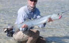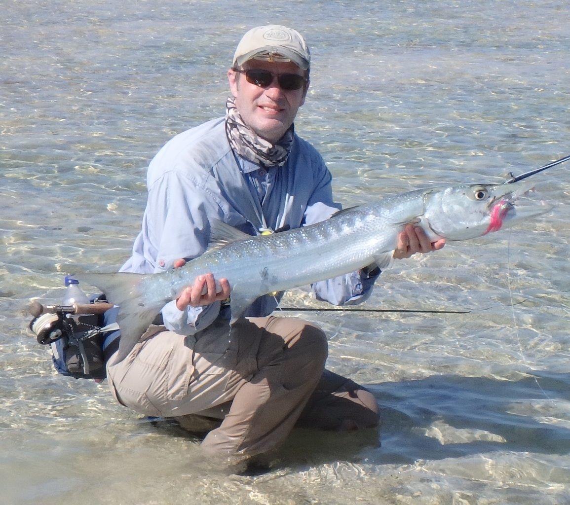I even upped the score with a bonefish of my own before we entered an area that we were expecting to hold quite a few fish based on previous experiences. At the top of this flat is a creek area that allows the water to flow off (it’s fed by another inlet where we exit). At the top end of the flat is a slight depression, probably scoured out by the water picking up speed as it leaves, and in there sat a nice sized barracuda facing the flow (and probably hoping for a meal to be swept down towards it). I positioned myself to the side of the fish and made my first casts at it (I’ve written many times about how my fly fishing for cuda can involve many casts). Unfortunately things didn’t go exactly to plan and the fish moved to a position that made it impossible for me to see due to the direction of the sun. However Tracy was on the other side of the depression and still had a perfect view of the cuda. With her guidance I was able to continue my ‘wind-up’ until anger got the better of it and it smashed my fly. One cuda targeted, one landed. (This ratio won’t last obviously – if it’s 10-20% by the end of the trip I’ll be happy).
