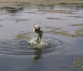 We rigged up a couple of baitcasting rods with braided line, and plastic frog lures, that due to their unique design are EXTREMELY weedless. The key to the design is that the hook rides point up and is partially obscured by a hollow, soft plastic collapsible body that allows a proper hook set when a fish strikes. These lures when fished over heavy vegetation produce extremely vicious, explosive strikes. And although the hookup ratio is often quite low, the sheer excitement of the visual display of ferocity more than makes up for the lack of fish brought to hand. Many times you can coax the same fish to strike a second, occasionally even a third time after they've missed it on the initial presentation.