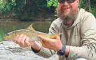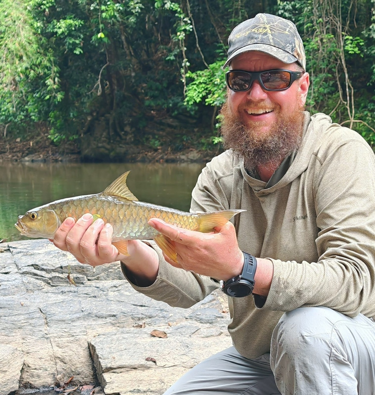 Hadi takes me upstream and we spook some nice mahseer on the way. We are passing huge log next to the shore, when underneath some good size fish take off. That was something new.