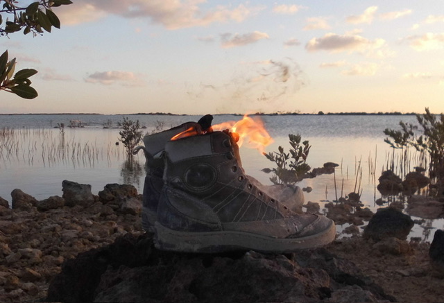 When I managed to catch up with James, he was stalking a tailing bone and when he hooked it, he radioed me to say it was a nice fish. I had watched him cast to it and then saw the bone tail on his fly, then speed away and heard his reel fly. It is always lovely to watch such a spectacle and I managed to get several photos of him playing the fish and holding it once he landed it. We estimated it was around 6lb and a great fish to finish the day, and also the holiday on. After 30 days of fishing, we were pretty knackered and personally besides my feet killing me, my shoulders and back needed a break too. As commented by James I had some problems with both pairs of fishing boots I had with me and we decided to ceremonially burn one pair on the water's edge before we left the flat in order to appease the bonefish gods. The other pair, the ones I wore on the last day, were left in the garden of the cottage we stayed in, as ornamental decoration, these smelt almost as bad as a pair of Paul's socks so will make an excellent addition to the aroma of the local flora.