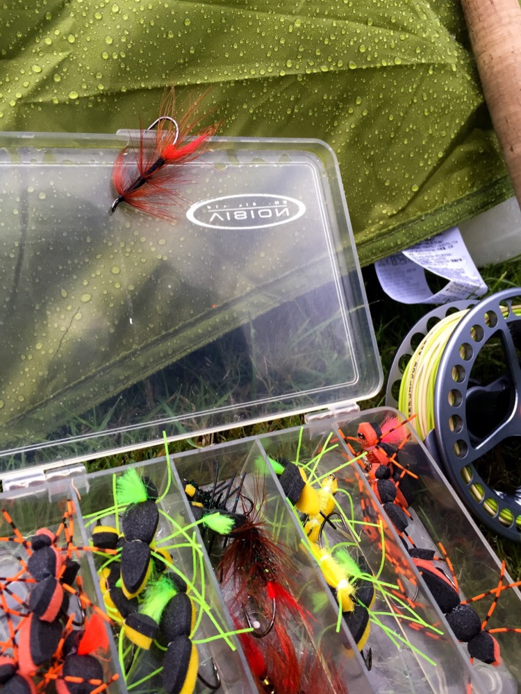 As you can see in the picture, live from my little tent camp (in the rain), I've been fishing foam beetles for sea trout. That's a great way to catch river sea trout, and really effective sometimes (although I didn't have any luck yesterday). Fished upstream and actively a foam beetle can illicit exciting strikes from sea trout. But that's really for another FP, because it's the fly hanging on the lid of the box I want to write about.