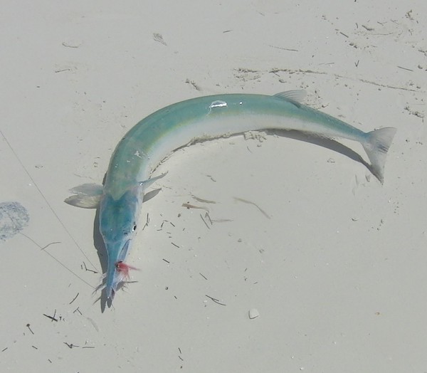 I have often wondered if the way to ‘hook’ them is to use a fly with some form of yarn that tangles in their teeth or around their rough bill. Apparently Garfish have a very good eyesight and will easily spot small flies from great distances so colourful flies such as orange are supposed to be good, though the one I hooked on was pink.