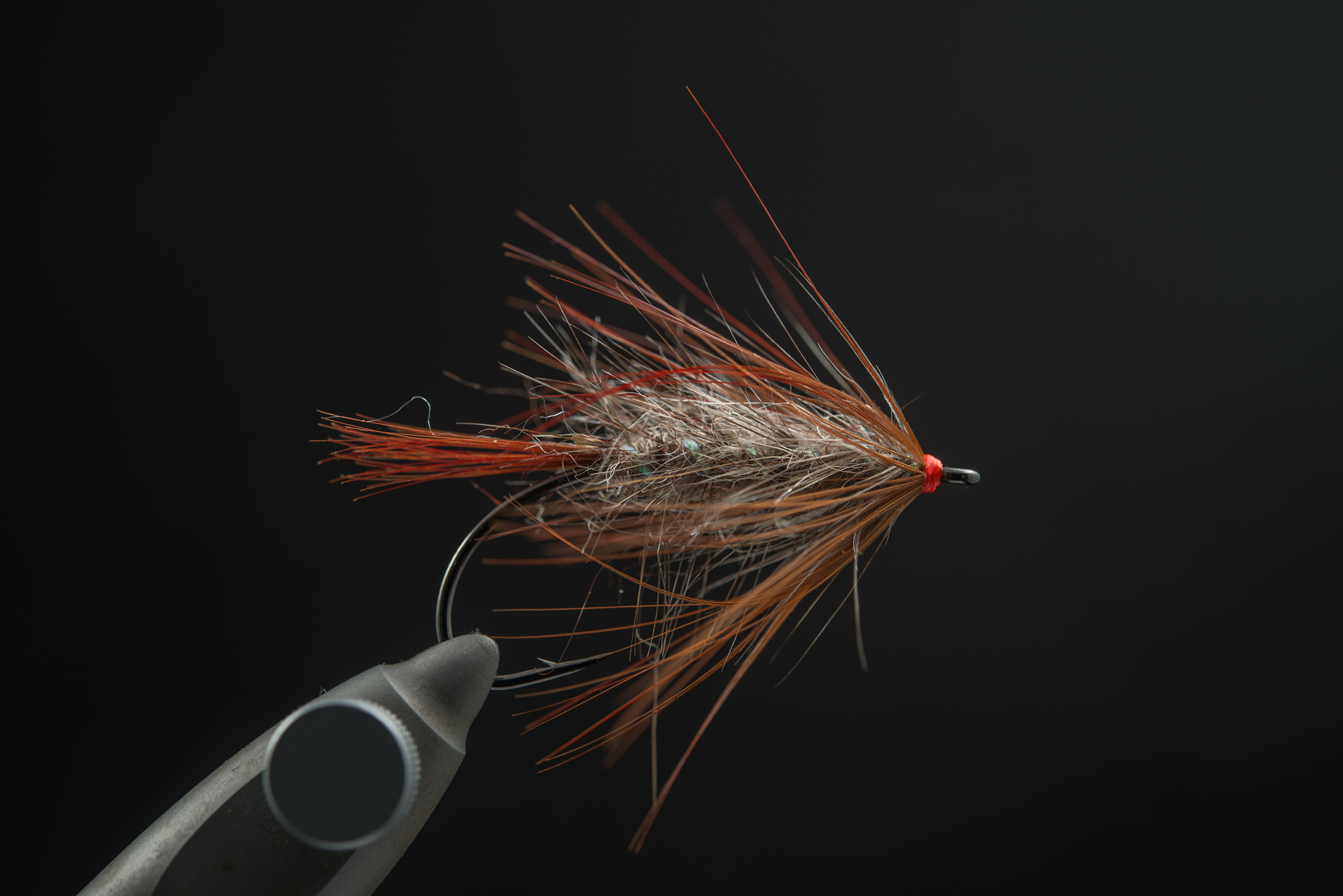 The breast feather have long, red, ever so slightly stiff fibres that have a very distinct action in the water. I use them quite a lot on both salmon flies and salt water flies for sea run browns. On the salmon flies, a few patterns I use have them for front hackles, but mainly I use them on shrimp-type-flies, like the famous Ullsock (Woolen Sock) from River Mörrum in Sweden.