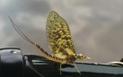 The duns are huge and clumsy but are hard to catch in hand. The healthy ones that shed their shucks, lift off and aim for the highest trees. The background color of their wings is a pale yellow with a slight green cast. The wings have a dark venation with an almost black shade of brown mottling over the background. Their thorax is cream colored. Their underbody and legs are cream colored and the top is grey brown. They have three black tails. Their body length averages 32mm and their tails are about as long as their abdomen. (see photo)