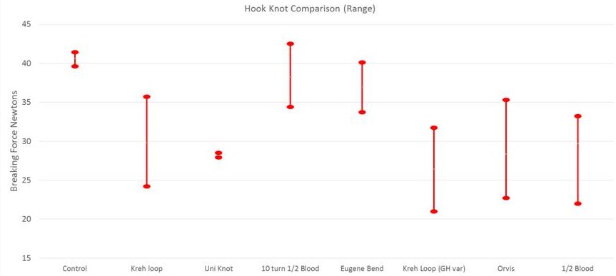 The two stand-out knots of this series were the 10 turn blood knot and the Eugene bend, with averages of 94% and 91% respectively. Even the lowest result from these two was over 83%, impressive I’m sure you’ll agree.