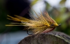 The original (link to video) is geared 100% towards night fishing for sea trout with its purple front hackle (purple disappers later than blue, Paul), purple body and black hackle. I've written before that yellow (especially sunburst yellow) and red a hot colours in Scandinavia for salmon. And since I really enjoyed the style of this fly, I decided to experiment with a few yellow versions.