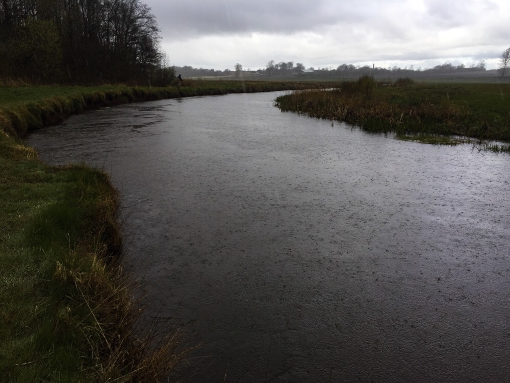 This is where the rain comes in, and it was very clear yesterday. From a smooth surface flowing nicely along, the rain suddenly revealed current-seams. I've seen this many times, but it was very instructive yeaterday, and even in a river like River Varde, where salmon can easily hold practically wherever they want, I still believe any changes in current are important to notice. Even small changes can make a difference in where a fish chooses to lie and which exact part it follows up the river.