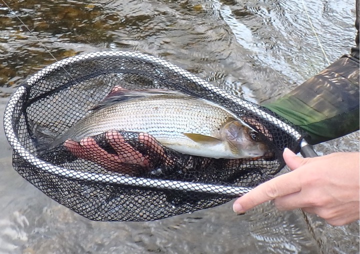 Having fished to the top of the beat on the ‘new’ side of the river (and having caught a few fish on the way) we thought we’d try a different crossing point on the way back. We found a likely looking spot right at the beat limit where a glide breaks into a fast riffle, albeit with an ominous looking channel on the far side. I knew from fishing the other side that there was deep water close to the bank, in fact I always fish that small section from dry land rather than wading (there’s almost always fish holding right at the tail of the glide eager to snatch a suitable dry fly). As such, I thought it would be prudent to take Tracy’s wading stick before I attempted the crossing for the first time. I’m really glad I did because without it I’m not sure I’d have made it through the waist-deep, fast water on the far side. Having just about made it to the other side, thus proving it was a possible (but not easy) crossing, I returned to Tracy who was waiting (perhaps anticipating me getting swept downstream) for the verdict. Getting back to her was actually quite a bit harder than going the other way, probably because I was now traversing slightly upstream rather than down. After seeing my exertions Tracy decided that this was not a crossing point for her and we returned to the spot where we’d crossed the river earlier in the afternoon. Again this one proved to be relatively easy apart from the last two metres. However, once we’d thrown our rods, bags, nets etc. up the bank, the climb out was not too bad, if a little undignified.