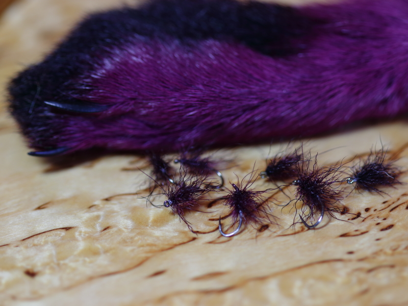 We had discussed claret very often in the recent a more distant past. It seems to work very well for trout and grayling. So I dyed a few hare front feet in that colour.