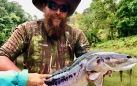 Moved into another bay and a Snakehead rises in front of the boat. Shot goes wild - no! - fish still seen. Picked up and shot goes in, properly this time. Fish smashes fly and fish on! Fish dives into snag. After a bit of a tussle fish out of snag and 3.5KG Toman in the boat with a chunk of the snag attached to leader! Celebrations all around.
