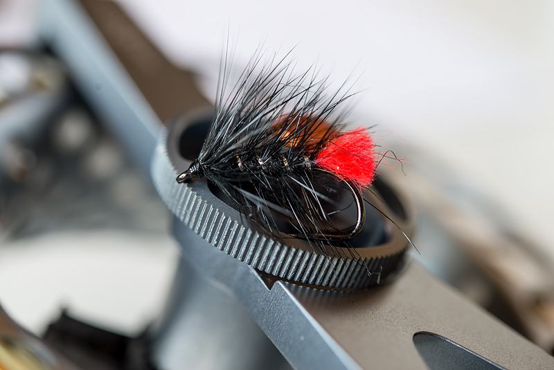 Hackle: Dyed black cock hackle paltered, and a 2-3 turns of slightly longer front hackle.