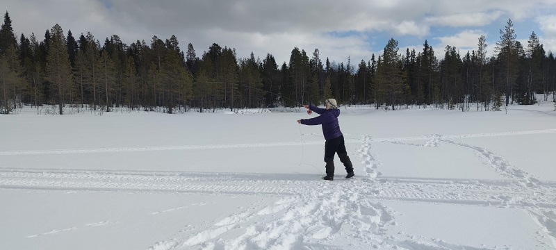 We set up our rods and I put bomber fly on the line. I was hoping that it will give some resistant on snow. I could not be wrong more, snow was little bit packed because of wind so basicly fly was kind of floating on snow. Anyway we did our practise session around slipped lift pick. As I told earlier, I have used when fishing sometimes. Well, it didn’t feel like that. Lot of my fishing casts are coming from spine, I don’t really think about those. I just cast in style which fits best on that situation.