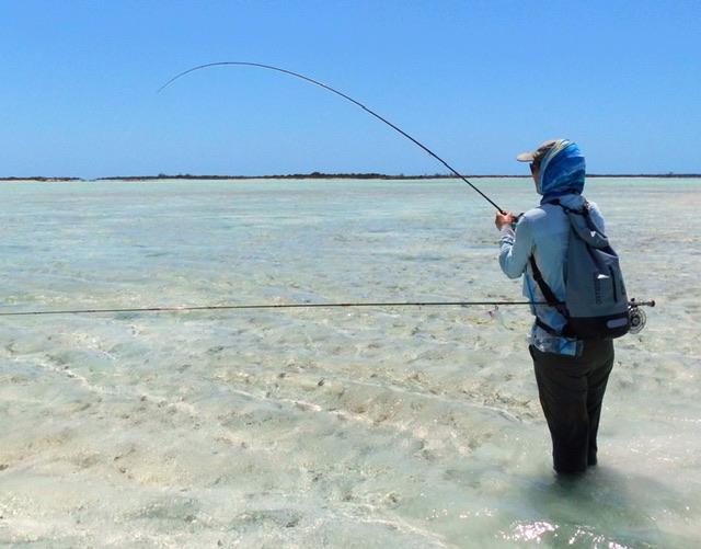 On a more positive note, we have had some good bonefish and have surpassed the numbers caught in our previous (5-week) autumn trip already. Also I caught and released a 4ft shark on my own at one flat as James was elsewhere (but in the same area and was contactable by walkie-talkie). Normally we would wait to go for sharks when we are together as it makes it easier to release if there are two of us. Though on this occasion there were about 7 sharks actively chasing fish on a large sandbar and I couldn't resist casting at them. I knew they would happily snaffle my fly if presented well and after nearly getting a take from a smaller one, which I flicked the fly away from, I targeted the biggest shark and first cast had it pulling line off my reel down to my backing. Releasing it wasn't too tricky on my own as I was able to beach him and manipulate the fly quickly out of its mouth then grab it by the tail and drag back into the water, where he swam away. When I started saltwater fishing, I didn't really fancy trying to catch a shark, nor would I have ever attempted to catch one whilst fishing on my own, however I seem to have become much more adventurous the more I do. Previously I would never have swum across channels as James does, however nowadays with my new backpack, I am quite happy to do so, although I do make sure James is close to keep a look out for big sharks.