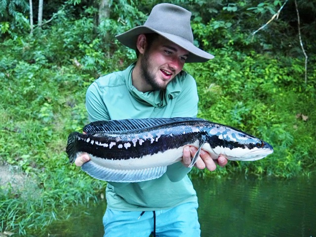 The next morning we were keen ready to fish, not really knowing what we were in for. We both jumped on Paul’s tinny and started looking for snakehead straight away, we saw some small bait that fooled Declan and I. It wasn’t long after that, that we saw our first set of babies. Too bad we ran right over the top of them. Paul played it off and gave the fish a few minutes and we found them again, they weren’t spooked!! Declan and I rocked off quickly for the shot. I won! I was already shaking like I’ve never shook before, seeing these two nice snakehead and their babies rise in front of us, I was so pumped full of adrenaline and excitement that I completely fell apart. I could barely pick my line up off the water. A couple of shots went in but nothing good enough to get an eat. That was all the shots I had for the first day. We made it back to the battle ship, Declan and I the most sun burnt we’ve ever been. Feeling so determined to get the shot in at the next opportunity, we both were practicing out shots again and again.