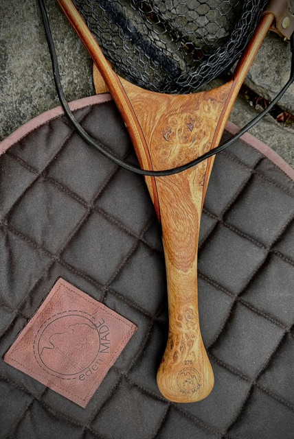 This isn’t ‘any’ net though , it’s an Eden Made hand-made wooden net. I’d already been up to the workshop to hand select the cuts wood for a handle of beautiful burr Oak. Roger of Eden Made nets is also inscribing a fish measurement scale on it.