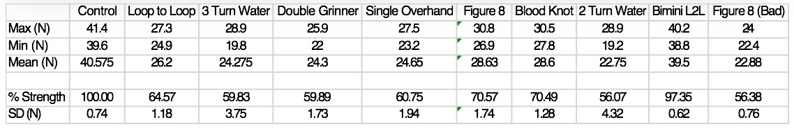 So perhaps this is the wonder knot as others have stated - especially if my tyings, after not much practice, all held firm. As such, the failure strengths recorded against the Bimini twists is the point at which the nylon material failed and not the knot. Compared to the control group the average was over 97.3% of the UTS - this 2.7% reduction could just be a statistical aberration arising from not enough data or it could be because of the residual twists (that I mentioned above) being forced from the knot into the main line during the test and weakening it very subtly. Note – in a fishing scenario these twists would not be confined as they are on my tester, I’d therefore have to agree that the Bimini twist is very likely a 100% strength knot. (I also suspect that given more experience in tying the knot I’d eliminate the residual twists).