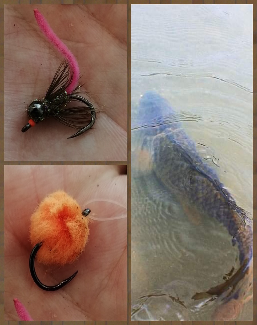 After around 15 approaches that became 6 or 7 shots, a few fly changes and tying a new, much longer leader, I finally came upon a fish that was feeding off the edge of some floating weed. Another fly change to an unweighted glo-bug, a short stalk and a long cast then drag back to let the fly hang just at the edge of the weed mat. After a couple of seconds the fish swam over and ate it like it was supposed to. It wasn't big, but I had earned it. I'd have been happy with that one fish, but still had about 600m of fishable bank. Changing back to a lightly weighted hybrid I started creeping downstream spooking fish and collecting refusals from what seconds earlier were perfect shots. Just as I was getting ready to call it, I saw 3 fish that were only half a shot, a bit far, a bit hard to see and in maybe 20cm of flat calm water . As I made the cast I saw one of turn away from me. I was sure I'd line it and spook the lot of them and the bow wave it produced seemed to confirm it. Then it stopped and tailed perfectly on the fly and I was in again. Another small fish maybe 4 or 5lb, but a great moment. One of those eats that you remember for ages.