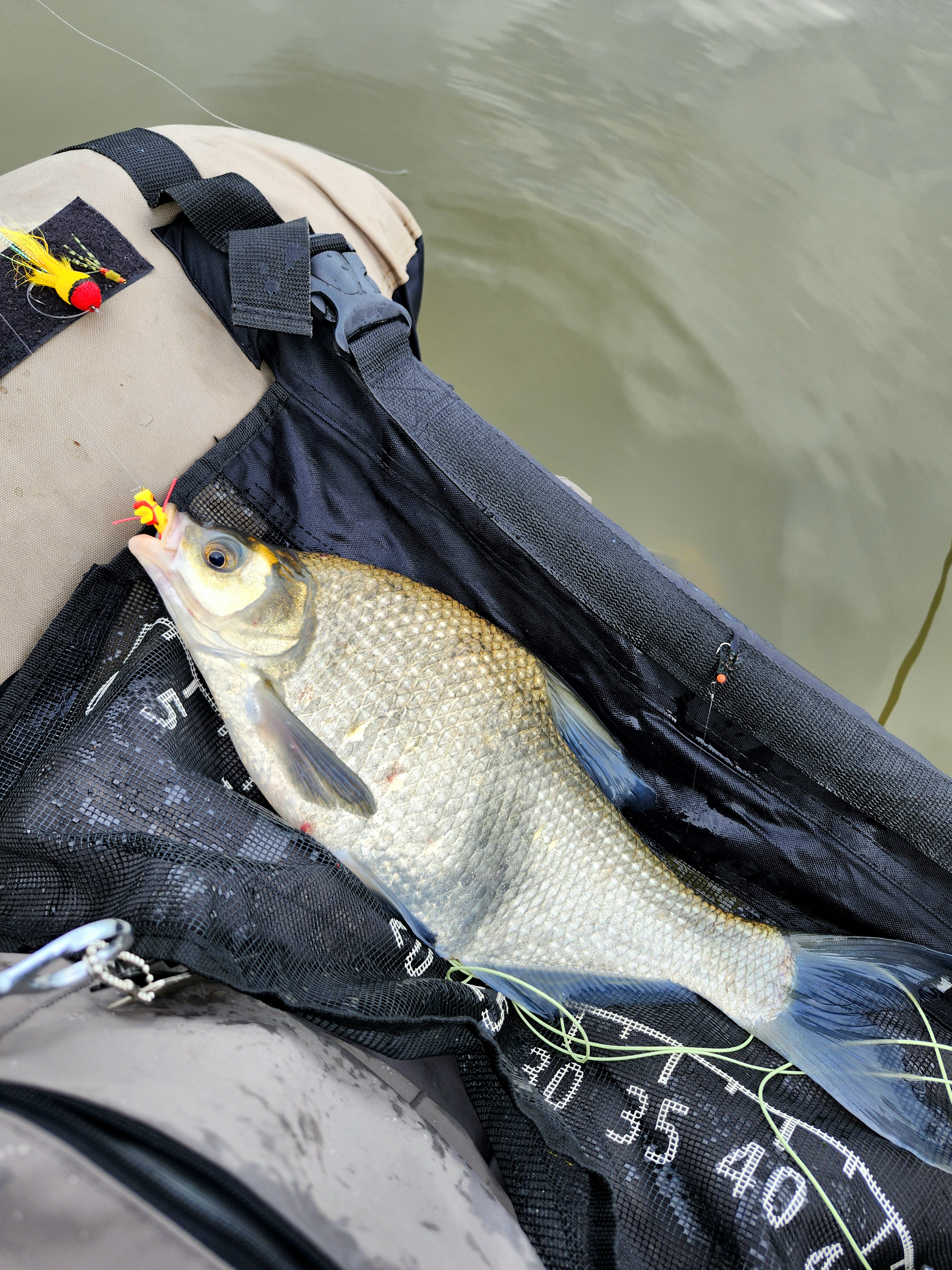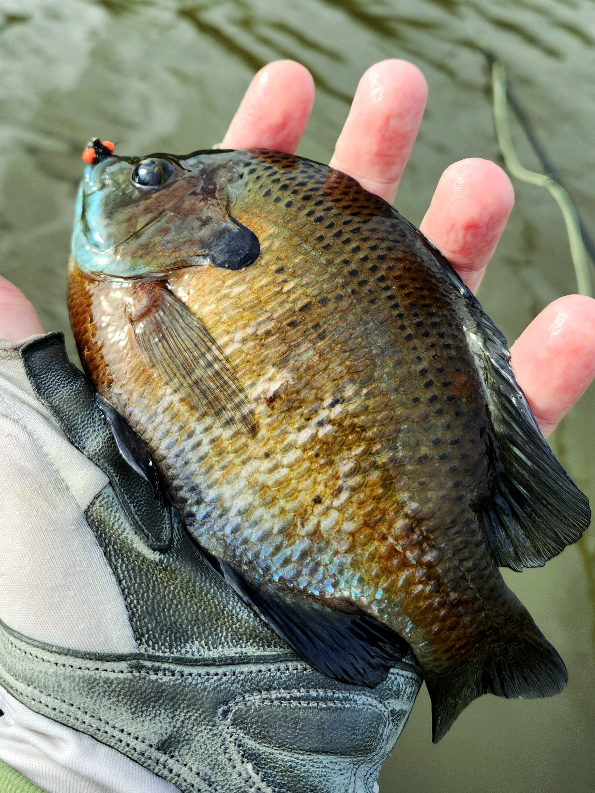 Chuck was continuing to pick up the gills and some other fish on his leech, so I wasn't surprised when my popper started jiggling almost immediately I put the flies next to some standing wood. I decided to rig up the 3wt with a smaller "indicator" but the same dropper fly so I could get a bit of fun out of any bluegill in the area and still have enough stick for a bass. Chuck has recently taken to a 0wt glass for bluegill. It's a lot of fun, but it's also absolute chaos when he accidentally hooks something else. Having rerigged I put the flies back in next to the standing wood and the popper shot under before it had settled. A bass! No. Another catfish about 6 or 7lb that lead me on a merry dance for several minutes before it's pads rubbed through the leader. A retie and another cast back in to the structure which was met with a nice bull bluegill about 8 or 9". Far more civilised. I didn't get any huge panfish, but I got plenty of nice ones around that size with the fly being a bit big for the little guys. I still enjoy them, in many ways I enjoy them more than small trout. Maybe it's because they're more of a novelty for me because I didn't grow up with them, but it's probably also connected to them being so pretty, I'd gladly keep some in a tank.