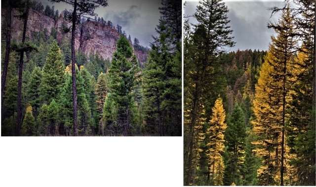 Something else I did, just today. I went for a ride in the chilly drizzle for a little exercise. I’ve been riding up the main dirt roadsince we moved here. The scenery doesn’t change much on that road -- forest on both sides with a few properties. Today I tried a new route even though I was uncomfortable exploring it by myself in the grey drizzle on Halloween. To my surprise, I came across a beautiful palisade and some vibrant larch in full fall color. The photos below don’t do either justice.
