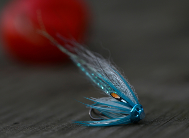 Fresh in the river salmon tend to like blue and the clear water got me thinking about blue. There’s a tendency that salmon are more likely to strike the later they see the fly, so they have less reaction time. So blue and yet inconspicuous. Pearl and white it was and this is the fly that came out of those thoughts. For clear and low water they shouldn’t be too big, so this is just 5cm long. I can really see this racing across a river in low, clear water with fresh grilse.