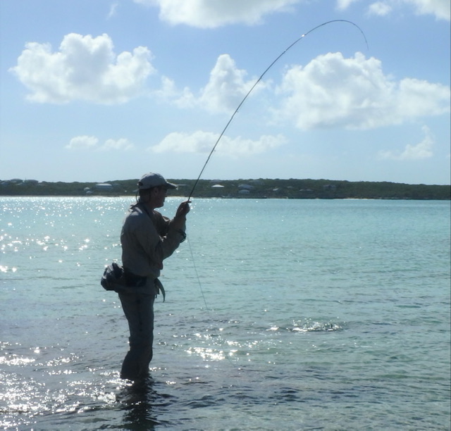 Another day with a high tide during fishing hours saw us return to the rough flat area that I mentioned in a previous FP, the one where I saw two large bonefish that totally ignored my fly. This time I selected a big fly with a weed-guard and commenced walking down the side of a crinkle rock island whilst Tracy headed off at 90 degrees to check out some lagoon type areas. The first bonefish I encountered I pretty much walked into, it was sat on dark brown grass in knee deep water so it was a difficult one to spot. It didn’t spook, rather it swam around me in the general direction of where Tracy was. The second fish I spotted was deep amongst the mangrove bushes – pointless to even cast at given its position, so I moved on. Next I saw three fish together on the outside of the rough area, away from trouble, giving their position away by occasionally cruising over areas where the brown grass gave way to clear rock. A fairly straight forward cast saw one of these fish pounce on the fly, however it immediately ran straight at me and then behind into the mangroves. The leader parted before the fly line was even off the reel, it was a good fish too. I added a new tippet and a new fly and continued to wade. I hadn’t got far when I spotted some more fish, possibly the same group. Again the fly was instantly taken and this time things seemed to be going in my favour as another good bonefish took off in a ‘safe’ direction. However, again before the fly line was out of the tip ring, the fish did a complete 180 roostering the line all the way into the mangroves with the same result as the first fish. As you can imagine I was a little frustrated as I attached my second new tippet and fly in a matter of minutes. I paused at this point to compose myself and have a biscuit (our standard lunch when out on the flats). From where I was I could see a nice clear corridor of sandy bottom that I decided deserved to be waded. I accessed this by traversing a waist-deep dip a couple of metres wide which quickly shallowed to a perfect knee depth. The moment I stepped on this sandy area I spotted a fish coming down it, and a big one – it took me a second or two to confirm it was a bonefish and not a cuda. In the shallower water with a clean bottom and great visibility I decided to lead this fish by quite a way with my cast, maybe 20ft. It was obviously the perfect distance because as soon as the fly touched down on the bottom the bonefish accelerated and tipped, my first strip was in fact a strip-strike. Now I’ve been bonefishing for a couple of decades now and I have caught a lot of bonefish, big and small. I’ve been told on at least three occasions that I’ve had a 10lb-er but these fish never seemed to hit the size that I would expect of a double figure fish. However from the moment this fish took the fly I knew, it was the second largest bonefish I’ve seen on this trip – the largest did a u-turn whilst it was still a good 35 yards from me so I didn’t even get a shot at that one. Luckily this fish ran into a completely clear area and behaved nicely during the fight – it did set itself aside from most bonefish in that it felt very heavy during the retrieve after the first run. Incidentally, that first run was nowhere near the distance of the ‘Usain Bolt’ bonefish that I reported last week. After landing it, and taking a really crappy photo, I’m now content to say I’ve finally had a double figure bonefish – a fish of a lifetime as far as I’m concerned.