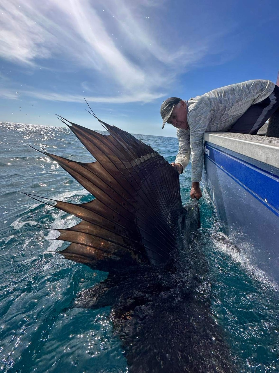 Initially I was told to use a 12wt Leviathan fast sink line. The idea was to get the fly down to the fish. The problem was with the soft bite, you could not see the fish to read what it was doing. In frustration, I swapped to a floating line on the basis that the fish was chasing the teaser on the surface. This meant that I could still see the fly, and read the fish. I fitted a Cam Seigler popper head. Land the fly behind the fish, bloop it once and stop so the sailfish does no keep trying to kill it. Sailfish have amazing hearing, and usually will turn and swoop on the fly.