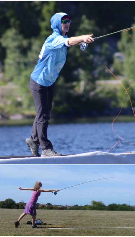 Away from assaulting giants, I've been asking Tracy to perform a number of off-the-ground casts with a shooting head. These are started in slow motion until the hands are in the position to haul apart, with the rod hand stabbing upwards. (I should say here that this can produce some spectacular tailing loops unless the lead up is smooth and accelerating). One thing I have found is that by lengthening or shortening the overhang the caster gets some feedback regarding the haul timing. On a short overhang the backing knot impacts the tip ring (juddering the cast) when the haul has moved just a short distance, thus the caster can feel if they've started early. As another aside, I think axe-throwing (or certainly in Tracy's case) is a symptom of going too early with the power application – a very common problem with people wanting to increase their distance. By lengthening the overhang to a fraction shorter than the total hauling distance, Tracy gets some instant feedback as to the timing of the end of her haul and confirmation that she hauled it all the way.