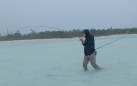 Torrential rain isn’t actually a disaster when flats fishing, Tracy and I have had some pretty epic days in seemingly horrible conditions. One that sticks in my mind was on Abaco where a storm front had ripped up a load of seaweed which was floating on the shore line where the waves were breaking. This weed was full of small, orange coloured crabs and the bonefish were feeding on these by sucking them off the floating debris. As such, they could be clearly seen just one or two feet out from the dry sand despite the very poor conditions for sight fishing. I remember looking in my fly box and seeing an amber epoxy resin pattern about the size of a finger nail (bought on a whim from somewhere and unused for years) and thinking it’s pretty much the perfect imitation for the crabs I found on the patches of weed that had been stranded up on the beach. The bonefish agreed, I don’t remember a single one refusing it, in fact they all dived and fought over it. I think I was getting up to double figures in terms of the fish landed (and good sized bones also) when the hook couldn’t stand the pressure anymore and snapped (the drag applied to each fish was much more than I’d normally apply due to the amount of weed the line picked up during the fight).