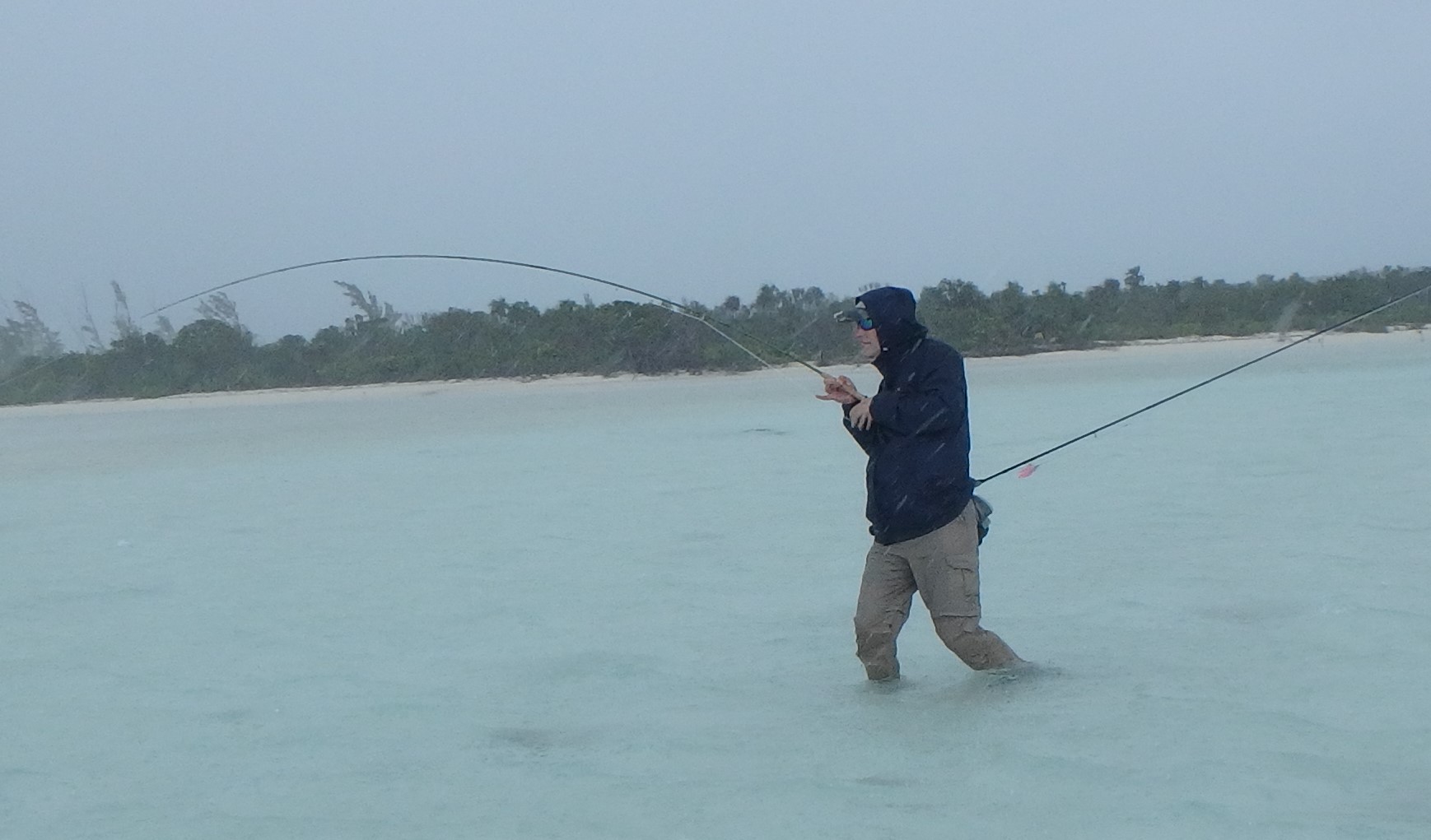 Another notable occasion was on Long Island where we’d headed for a spot with a very clear sandy bottom given the forecast for heavy rain. Sometimes in the Caribbean when it rains it’s like standing under a shower given the volume of water that’s coming down. This particular day was like that and I did start to question our sanity when standing out in such weather, until I spotted the first bonefish that is. The rain had flattened the water’s surface, so although the light was poor, it was still possible to spot moving fish at a reasonable distance, certainly far enough to be able to take our time and get a great presentation. Again, what followed was the sort of few hours fishing that we’ll never forget.