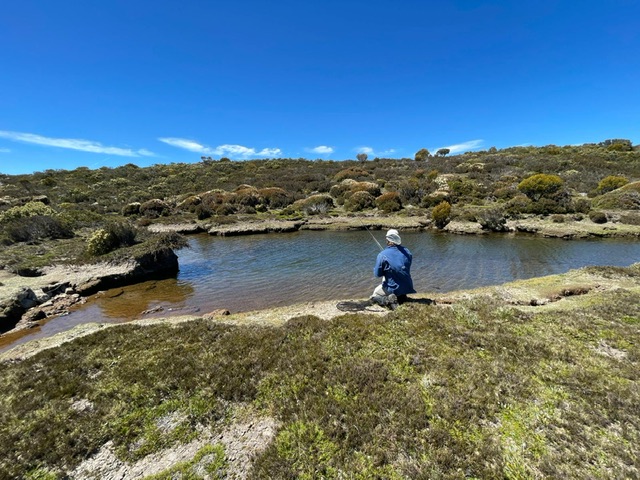 We got to the lake edge and saw the water was churned up, we were so disheartened and just powered our way out to make camp. On the way we had a quick rest at one of the huts. So exhausted we threw our packs down and took our shirts off, it was so hot!! After our break we kept on going and made a spot for camp, being late in the arvo, we had a one last shot at a bit of sight fishing. We made our way up a little creek, we got to a big pool and there was a fish jumping for black spinners, we were in!
