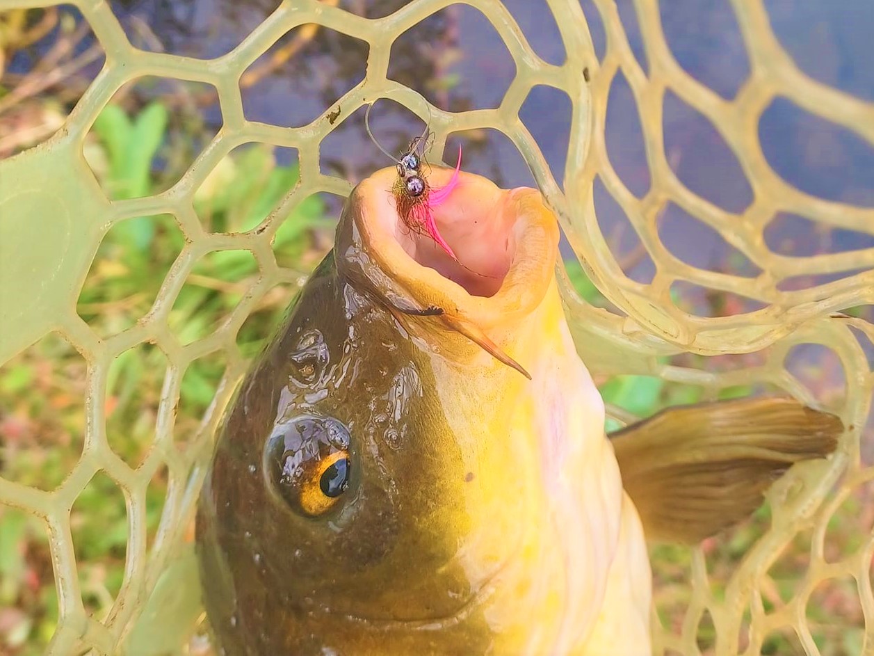 Obviously more natural stuff will work, but with low light it's far easier for you (and the fish) to track the fly. I reckon it's pretty important that you go with a fluorescent tone rather than just bright, at this time of year when the light is a bit dull, the UV end of the spectrum is most intense longest of the wavelenghts so it does make a difference to the visibility of the fly. You can see for your self, just take a fluo and non fluo fly out when the light is not yet good or coming off of being good and see which is most visible-an overcast day in winter is probably the most stark difference, but it holds true all year. Actually, I think a lot of people are far too conservative in colour choice for carp all year, but it's especially true in winter. If I could get away with it, I'd be fishing bright attractor patterns all year!